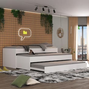 A Tricama para colchão 88 x 188 cm Multimóveis FG0739 é a solução perfeita para otimizar o espaço do seu quarto e garantir conforto para toda a família. Produzida em MDP, esta peça oferece resistência e durabilidade, além de um acabamento impecável em pintura UV que proporciona um toque sofisticado ao ambiente. A cama principal suporta até 90kg, enquanto as duas camas auxiliares comportam até 70kg cada uma - perfeitas para acomodar visitas ou irmãos que dividem o mesmo quarto. Além disso, a cama auxiliar maior possui rodízios que facilitam a sua movimentação. NÃO acompanha colchões (tamanho indicado de colchões: Principal: 88 x 188 cm | Auxiliares: 78 x 188 cm).