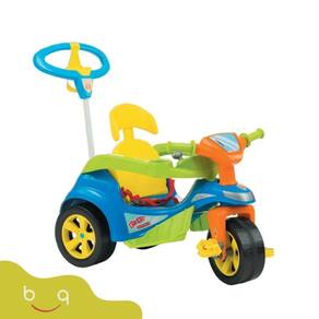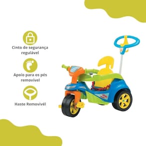 Benefícios: -Rodas largas com calotas e faixas de rodagem em relevo; -Apoio confortável removível para os braços com conjunto didático, e também, contém porta mamadeira; -Apoio para os pés removível com proteção; -Roda dianteira com sistema de pedais removíveis; -Cinto de segurança regulável de três pontos; -Porta objetos na parte traseira; -Haste articulada removível em aço carbono resistente com porta copo e gancho para pendurar sacolas; -Guidão com manoplas; -Assento anatômico antiderrapante com encosto regulável; -Encosto de cabeça regulável.
