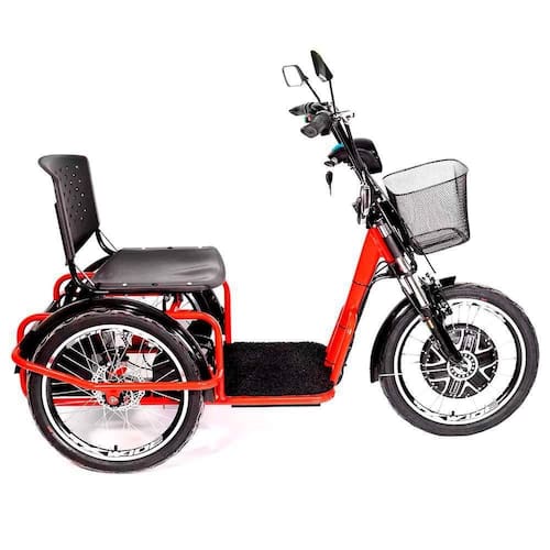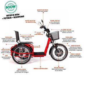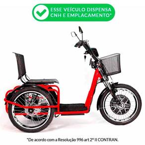 Triciclo Elétrico - Village PAM - Cesta - 800w - Vermelho - Plug and Move: o Triciclo Village PAM possui funcionalidades para melhorar seu dia a dia. O Village PAM tem motor de 800w na roda dianteira e vem equipado com marcha à ré (esse dispositivo é especialmente útil para manobras em locais de pouca mobilidade como garagens). Também vem equipado com sistema de alarme inteligente acionado por controle remoto: é um alarme sonoro igual ao de automóveis. Caso alguém tente mover o triciclo, o alarme sonoro com trava do motor é acionado (sistema anti-furto inteligente), impedindo qualquer movimento com o veículo. Você pode recarregar o Triciclo Village PAM em qualquer tomadaDetalhes:- Triciclo Elétrico Village com motor 800w de potência- Econômico: consumo de energia de apenas 1.2Kw/h- Com botão de marcha à ré: útil para manobras em locais de pouca mobilidade como garagens- Amortecedores dianteiros: auxiliam na absorção do impacto proporcionando conforto, estabilidade e segurança- Assento com encosto para maior conforto- Freio traseiro a disco - Freio dianteiro v-break- Possui botão de buzina- Paralamas dianteiro e traseiro- Baú traseiro para guardar objetos- Botão regulador de velocidade: que quando acionado permite que ele trabalhe em velocidade reduzida (sistema elaborado para pessoas de maior idade ou com problemas de locomoção, fazendo com que o triciclo mantenha sempre uma locomoção mais suave, diminuindo assim o risco de acidentes)- Farol diurno e farol de LED noturno com foco- Chaves liga-desliga e de alarme- Pode ser carregado em uma tomada comum- Equipado com Farol diurno e farol de LED noturno com foco- Com cestinha frontal para carregar itens e objetos- Possui 4 baterias de 12V cada, totalizando 48VInformações- Produto: Triciclo Elétrico Village PAM- Marca: Plug and Move- Tipo: Triciclo Elétrico com Ré e Cestinha- Categoria: E-Bikes e MUV- Modalidade: Cotidiano e Passeio- Dimensões (C x A x L): 158 x 100 x 78 cm- Velocidade média: 3 níveis de velocidade- 25Km/h - Velocidade I: - 35Km/h - Velocidade II: - 45Km/h - Velocidade III - Autonomia: duração média de 25 a 35Km por carga- Peso suportado: capacidade de Carga até 120 kg (acima disso, pode ocorrer perda de autonomia)- Volume (Peso): 59 kg- Rodas / Pneu: VZAN aro 20/Medidas: 20x1.75- Assentos: 01 assento com encosto - Freio? Sim. Freio Dianteiro: V-brake alumínio e Freio Traseiro: A Disco- Marcha? Sim. Com marcha ré- Amortecedor dianteiro- Conteúdo: - Triciclo Village- Cesto frontal- Carregador de bateria Bivolt 110/220 Especificações:- Modelo: Triciclo Village PAM- Referência: PAM222VM- Código de Barras: 7906234241116- Embalagem (C x A x L): 160 cm x 85 cm x 75 cm- Embalagem (Peso): 63 kg- Motor: Sem escova de cubo de 800w- Potência: Motor de 800w - Bateria: 4 Baterias de 12V 15Amp Total = 48V/15Ah- Freio: Dianterio V-Brake e Traseiro a disco- Freio adicional: manete de freio de mão- Farol: Farol LED redondo (diurno e noturno com foco)- Luzes: Freio e de sinal de mudança de direção- Material / Composição:- Estrutura: em aço carbono- Freio Traseiro: Disco- Freio Dianteiro: V-brake alumínioObservação: O triciclo é enviado pré-montado.- Ele vai praticamente todo montado, mas por questões de espaço na embalagem será necessário uma regulagem no guidão e freio e encaixar a cadeira. Esse serviço é simples e caso o cliente tenha um conhecimento básico ele mesmo poderá realizar. Se preferir poderá solicitar à um especialista que faça esses ajustes. O custo desse serviço é de responsabilidade do comprador do produto.Sobre a bateria.- O tempo de carregamento está entre 6 a 8 horas (nunca deixe carregando mais que 08 horas). As baterias devem ser carregadas a cada 15 dias sejam utilizadas ou não.Garantia:- 06 Meses (Motor e Baterias)- 03 Meses (Demais peças)Aviso:- As imagens são meramente ilustrativas- Os pesos, tamanhos, pesos e medidas são aproximados- As cores e estampas dos produtos podem ter variações- As informações são de responsabilidade do fabricante