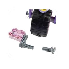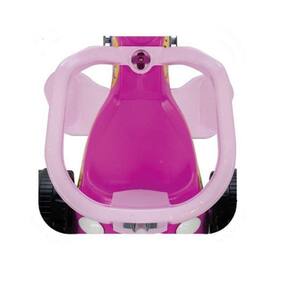 1. Rodas grandes com calotas coloridas; 2. Proteção lateral removível e banco anatômico antiderrapante; 3. Suporte para os pés anatômico e removível; 4. Haste articulada com porta copo; 5. Guidão com cestinha e retrovisores; 6. Pedais removíveis de acordo com a faixa etária da criança; 7. Manopla anatômica da haste articulável com porta copo; 8. Trava de segurança da proteção lateral.