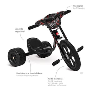Triciclo Infantil - Aro 14 - Speed - Preto - Bandeirante: qual criança não gosta de brincar de pedalar? O Triciclo Speed Bandeirante foi produzido com todo o carinho para que as crianças aproveitem os benefícios de pedalar. Perfeito para manobras radicas e derrapagens emocionantes. Design incrível e estrutura resistente e segura - em aço tubular - para que as crianças andem de triciclo de um jeito divertido e seguro Detalhes: • Roda dianteira aro 14 com pneus em E.V.A. Maior aderência e performance • Maior aderência e performance • Resistência e durabilidade • Estrutura em aço tubular • Assento regulável ao tamanho da criança • Peso máximo suportado: 25kg Informações: • Produto: Triciclo Infantil Speed Aro 14 • Marca: Brinquedos Bandeirante • Coleção: Speed • Tipo: Triciclo infantil para iniciantes • Tamanho do produto (C x A x L): 68 x 63 x 57 cm • Peso do produto: 6.2 kg • Tamanho da roda: 14 • Peso suportado: até 25 kg • Conteúdo: 1 Triciclo • Idade recomendada: para crianças a partir de 03 anos de idade Especificações: • Referência: 298 • Código de barras: 7899091402984 • Embalagem (C x A x L): 57.5 x 61.5 x 28 cm • Embalagem (Peso): 6.750 Kg • Material / Composição: aço tubular • Registro: 003835/2021 • Certificado: Órgãos Autorizados - OCP´S (Organismos de Certificação de Produtos) Benefícios de andar de triciclo • Reduz a ansiedade e o estresse • Estimula a criatividade e imaginação • Estimula o equilíbrio e a coordenação motora • Colabora com a autoestima e a autoconfiança • Fortalece a massa óssea, articulações e músculos • Combate a obesidade e aumenta a resistência física • Estimula a atenção e o senso de direção e noção de espaço Aviso: • As imagens são meramente ilustrativas • Os pesos, tamanhos e medidas são aproximados • As cores e estampas dos produtos podem ter variações • As informações são de responsabilidade do fabricante ou fornecedor