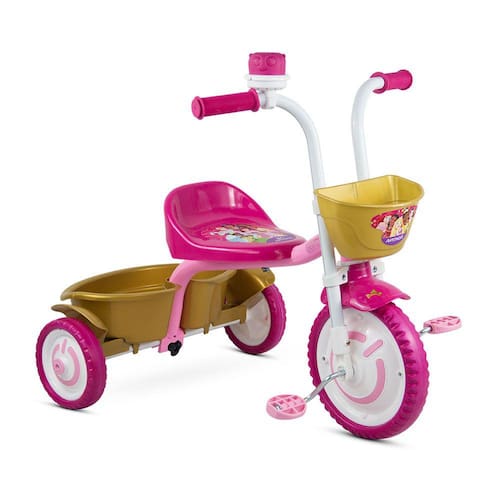 Triciclo Infantil - Aro 5 - Disney Princesas - Nathor: as primeiras pedaladas das crianças são muito mais seguras e divertidas com este lindo modelinho de triciclo das Princesas da Disney. Completamente dinâmico e ergométrico, possui um pedalar macio, silencioso e confortável. Este triciclo infantil é indicado para crianças a partir dos 18 meses de idade ou com altura entre 85 cm a 100 cm. Diversão garantida para as crianças. O triciclo Nathor tem quadro, garfo e guidão em alumínio, por isso é super leve (pesa só 2kg) e garante mais durabilidade (não enferruja). Seus pneus em E.V.A. são silenciosos, menos escorregadios, mais leves e duráveis. Para evitar acidentes, o Triciclo em alumínio Aro 5 Princesas Nathor ainda conta com limitador de giro do guidão, mecanismo que impede que a criança consiga virar demais o guidão e, consequentemente, se desequilibrar. As manoplas são fabricadas em material atóxico, e buzina “fon-fon” faz a brincadeira ficar ainda mais animada! Detalhes • Quadro, garfo e guidão em alumínio • Pneus em E.V.A. • Manoplas em elastômero TPE atóxico • Limitador de giro do guidão • Cestinha • Buzina “fon-fon” Limitador de giro do guidão: • Mecanismo que impede que o guidão gire além do necessário. O Limitador evita acidentes, permitindo um pedalar com muito mais tranquilidade e segurança para a criança. Produzido em alumínio • Quadro, garfo e guidão feitos em alumínio, o triciclo Nathor é muito mais leve. Possui também maior durabilidade por não enferrujar. Pneus em E.V.A: • Além de serem mais silenciosos, os pneus em E.V.A. garantem um pedalar mais macio, menos escorregadios, mais leves e duráveis. Informações: • Produto: Triciclo Infantil Princesas Disney • Marca: Nathor • Coleção: Disney-Princesas • Tipo: Triciclo infantil • Tamanho do produto (C x A x L): 64 x 52 x 46 cm • Peso do produto: 2.180 Kg • Tamanho da roda: Aro 5 • Altura recomendada: 85 a 100 cm • Peso suportado: até 21 kg • Conteúdo: - 01 triciclo - 01 cestinha - 01 manual • Idade recomendada: para crianças a partir de 18 meses de idade Especificações: • Referência: 100580160002 • Código de Barras: 7898322524143 • Embalagem (A x L x P): 43 x 38 x 26 cm • Embalagem (Peso): 2.780 Kg • Material / Composição: - Quadro, garfo e guidão: alumínio - Pneus: em E.V.A • Registro: 004983/2019 • Certificado: Órgãos Autorizados - OCP´S (Organismos de Certificação de Produtos) Aviso: • As imagens são meramente ilustrativas • Os pesos, tamanhos e medidas são aproximados • As cores e estampas dos produtos podem ter variações • As informações são de responsabilidade do fabricante ou fornecedor
