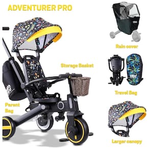 Portátil e conveniente: o recurso dobrável exclusivo do Trixplorer Adventure Pro facilita o transporte e o zenamento. Ele vem com capa de chuva, bolsa para os pais, bolsa de viagem e cesta para maior comodidade durante suas aventuras ao ar livre.