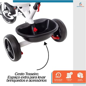 Porta-Objetos: Inclui cesto frontal e traseiro para levar brinquedos e acessórios.