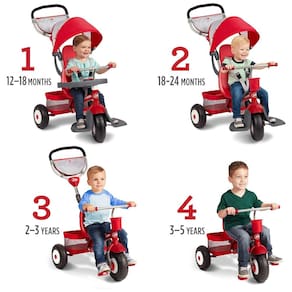 IDADES DE 1 A 5 ANOS As 4 etapas incluem triciclo infantil 12 meses 18 meses, trike de direção 18 meses 24 meses, trike para aprender a andar 2 3 anos e clássico triciclo 4 5 anos.