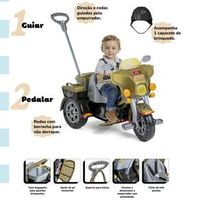 Função Pedal: basta retirar os acessórios e o triciclo estará pronto para pedalar, proporcionando uma experiência completa de aventura e emoção.