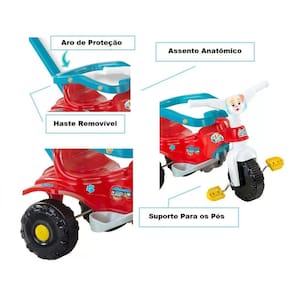 Este Lindo Triciclo tem assento anatômico para melhor conforto do seu bebê, vem aro de proteção lateral e suporte para os pés, para segurança. E a haste de empurrar, são removíveis, assim, quando a criança crescer poderá alcançar os pedais e o guidão.Produto de qualidade e segurança.Benefício: É uma boa e divertida alternativa para se passear com seu filho. Auxilia no desenvolvimento de habilidades visuais, auditivas, coordenação motora e raciocínio.Dimensões Aproximadas do Produto: 78,5cm x 41,5cm x 97,5cm(Altura x Largura x Comprimento/Profundidade)Dimensões Aproximadas da Embalagem: 29cm x 40cm x 54cm(Altura x Largura x Comprimento/Profundidade)