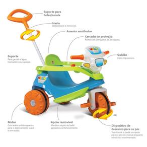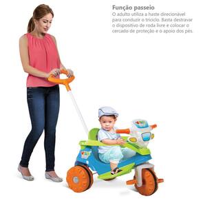 O Triciclo Infantil Velobaby - Passeio e Pedal - Bandeirante é prático e moderno para o adulto e divertido para as crianças. Ideal para ser o primeiro triciclo de passeio dos pequenos. Além de estimular o desenvolvimento das crianças, também contribui para momentos incríveis e para a diversão da criança. FUNÇÃO PASSEIO: O adulto utiliza a haste direcionável para conduzir o triciclo. Basta destravar o dispositivo de roda livre e colocar o cercado de proteção e o apoio dos pés. FUNÇÃO PEDAL: Permite à criança pedalar livremente como um triciclo convencional. Basta travar o dispositivo de roda livre e remover o cercado e o apoio dos pés. DETALHES - Dispositivo de roda livre transforma o pedal em apoio para os pés da criança enquanto o triciclo é movimentado. - Assento anatômico. - Rodas com anéis antiderrapantes para deslocamento suave e sem ruído. - Cercado de proteção removível com painel interativo. - Suporte para garrafa d'água, mamadeira ou squeeze. - Apoio removível para os pés mantém os pés da criança apoiados confortavelmente. - Haste direcionável e removível. - Guidão com chip Sonoro. INFORMAÇÕES • Produto: Triciclo VeloBaby 2 Funções • Dimensões: (CxLxA) 118 x 55 x 97 cm • Peso máximo suportado: 30kg. • Marca: Brinquedos Bandeirante • Certificação Inmetro: CE-BRI/INNAC-00143-01A. • Idade Recomendada: a partir de 12 meses de idade AVISO • As imagens são meramente ilustrativas. As cores e estampas dos produtos podem ter variações. As informações são de responsabilidade do fabricante ou fornecedor. ATENÇÃO: • Comprar Triciclo Velobaby - Passeio e Pedal - Bandeirante no Mundo Encantado é fácil. Aproveite nossas condições de pagamento? Oferta válida por tempo limitado. Produto sujeito a disponibilidade de estoque.