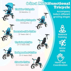 -?Triciclo 6 em 1 para crianças pequenas?Este triciclo JOY 6 em 1 acompanhará os diferentes estágios de crescimento do bebê. Ele se converte de triciclo infantil (10 meses ou mais), triciclo de direção (18 meses ou mais), triciclo para aprender a andar (2 anos ou mais) em triciclo de treinamento, triciclo independente ou triciclo clássico (3-5 anos). Assim, o treinamento do equilíbrio, as habilidades motoras e a coordenação olho-mão do bebê podem ser melhorados.