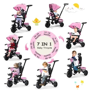 Triciclo infantil Kinder King, triciclo infantil dobrável 7 em 1 com alça ajustável, assento giratório, dossel ajustável, cinto de segurança, armazenamento, carrinho de bebê para maiores de 6 meses, rosa