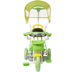 Fabricado com materiais que conferem alta resistência e eficiência ao produto. O Triciclo Motoca é o companheiro ideal para as aventuras dos pequenos. Com aro protetor, apoio de pés, empurrador e pedais, a segurança e a alegria estão garantidas. Tirando os acessórios, vira motoquinha e a criança pode pedalar livremente. As crianças podem levar sua garrafinha de água no compartimento na frente ou atrás do carrinho. Toca música e acende luzes. Ideal para passeios com seu filho(a) no parque, na rua, no shopping, além de um triciclo para empurrar. Vai com capota (pequeno toldo) removível para proteger do sol.