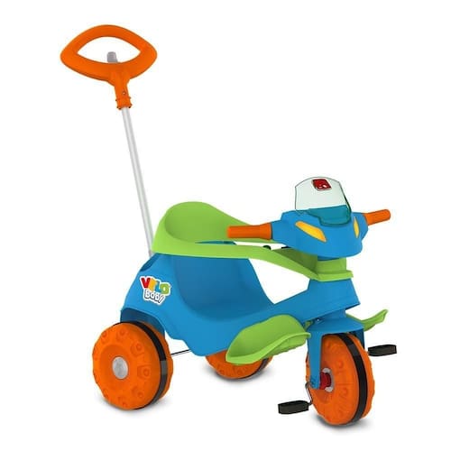 Triciclo Velobaby Passeio e Pedal Azul BandeiranteO Velobaby Passeio e Pedal é prático e divertido, oferecendo duas formas de uso: no modo passeio, o adulto conduz com a haste direcionável, e no modo pedal, a criança pode pedalar livremente. A transição entre as funções é simples: basta remover a haste, o cercado de proteção e o apoio para os pés.
