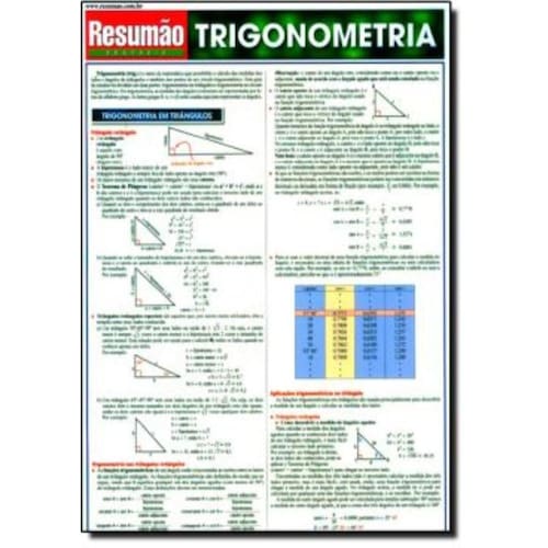 O ´Resumão Trigonometria´ cobre os princípios básicos da trigonometria - as equações são explicadas de forma clara e direta, com o uso de diagramas e quadros para facilitar o entendimento. Conteúdo - Trigonometria em triângulos - trigonometria nos triângulos retângulos, aplicações trigonométricas no triângulo. Trigonometria no círculo trigonométrico; círculo e ângulos centrais, ângulos gerados. Trigonometria analítica - expressões, equações e identidades. Fórmulas e identidades trigonométricas fundamentais - recíprocos, co-funções, identidades básicas, fórmulas de adição e subtração, negativos, fórmulas de dobro de ângulo, fórmulas de meio ângulo, fórmulas de soma e produto. Recomendado para estudantes universitários e alunos do segundo grau e de cursos profissionalizantes. Essencial para repassar a matéria antes de provas e exames de vestibulares. Pela facilidade de consulta imediata e rápida, o ´Resumão Trigonometria´ é de grande utilidade para professores e profissionais.