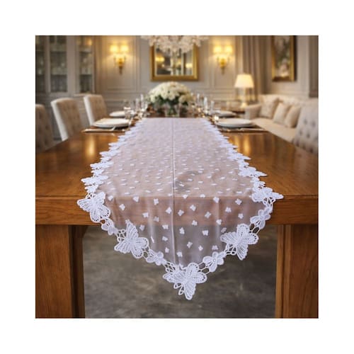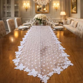 Trilho Caminho de Mesa em Renda Guipir com Tule Poá Borboleta Luxo,é perfeito para quem deseja uma decoração delicada e sofisticada. A combinação da renda guipir com o tule poá traz leveza e charme à peça, criando um visual elegante e ao mesmo tempo moderno. Na cor branca, é ideal para valorizar mesas de jantar, aparadores e buffets, adaptando-se facilmente a diferentes estilos de decoração. Com medidas de 2,00 x 0,40 m, proporciona excelente caimento e destaque ao ambiente, sendo uma ótima escolha para ocasiões especiais, recepções, festas e celebrações. Um trilho decorativo que une requinte, suavidade e luxo, transformando a composição da mesa com muito bom gosto.