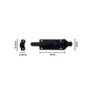 Informações técnicas: Cor: Preto Acabamento: Brilhante Dimensões: - Largura: 9cm - Altura: 3cm - Distância entre os furos vertical : 22mm fecho - Distância entre os furos vertical : 23mm encaixe do fecho Material: Aço Com porta cadeado Acompanha parafusos para fixação Marca: Não Informado