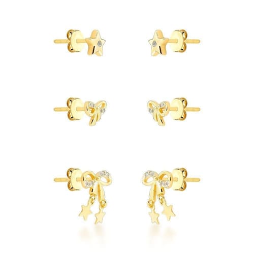 Trio De Brincos Laços Delicados Banhado A Ouro 18k Trio de Brincos Laços delicados Banhado a Ouro 18k - Este trio de brincos banhados a ouro 18k é perfeito para mulheres que amam acessórios delicados e versáteis. Com três pares em diferentes designs, o conjunto inclui um brinco de laço com pendente de estrelas de 0,7 cm, um brinco de laço com zircônias de 0,5 cm e um brinco de estrela com zircônia central de 0,6 cm. Cada par traz um toque único de brilho e sofisticação, ideal para compor desde looks do dia a dia até produções mais elegantes.