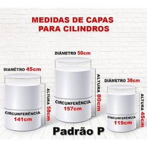 Capas de cilindro: Medidas padrão p do anúncio verifique as outras medidas na imagem do anúncio : Cilindro grande: altura: 80 cm x diâmetro: 50 cm x circunferência: 157 cm Cilindro médio: altura: 58 cm x diâmetro: 44 cm x circunferência: 141 cm Cilindro pequeno: altura: 45 cm x diâmetro: 38 cm x circunferência: 119 cm Não acompanha cilindros de mdf.