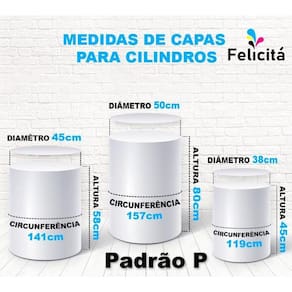 Cilindro pequeno: altura: 45 cm x diâmetro: 38 cm x circunferência: 119 cm