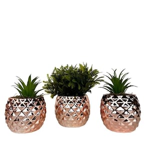 Material dos itens: Cerâmica. Cor Predominante: Rose Gold. Plantas artificiais acompanham os vasos.