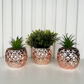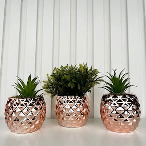 Decoração enfeite sala mesa lateral trio vasinho estilo abacaxi rose gold cerâmico com detalhe 3D e arranjo planta artificial moderna.