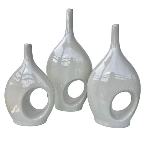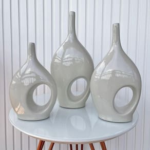 Decoração sala estante rack trio vaso ornamento vazado estilo garrafa de cerâmica na cor bege/areia 3 tamanhos diferentes enfeite de mesa para planta artificial. Uma ótima opção para compor a decoração do seu espaço com tons sóbrios e sofisticados. Que tal dar uma repaginada na decoração da sua casa, local de trabalho ou qualquer outro lugar que desejar, com muito estilo e bom gosto com esse lindo trio decorativo moderno, criando um ambiente sofisticado e elegante. Nova tendência na decoração contemporânea, produzidos em cerâmica, podem ser utilizados em ambientes internos ou externos ressaltando a beleza e harmonia na sua casa. Especificações: Cor Predominante: Bege. Material dos vasos: Cerâmica. Dimensões aproximadas: Dimensões do vaso pequeno: altura 24,5cm x largura 15,8cm x profundidade 7,5cm Dimensões do vaso médio: altura 32cm x largura 16,4cm x profundidade 8,8cm Dimensões do vaso grande: altura 38cm x largura 17,5cm x profundidade 9,5cm