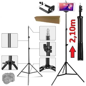 tripé robusto de alta qualidade, possui molas internas para amortecimento, braçadeiras reforçadas em nylon, altura de 2,10 mts, abertura dos pés de 88 cm promovendo boa estabilidade, pino 5/8 com rosca 1/4 para usar diversos tipos de equipamentos. Pintura preta, tornando - o mais discreto no ambiente de cine & foto. Reforçado, chegando a suportar 6 kg , pode ser utilizado com diversos equipamentos de iluminação. acompanha suporte para celular universal de acompanha . Além disso este tripé é um modelo muito recomendado para utilização junto a equipamentos fotográficos e iluminação, uma vez que possui uma estrutura resistente com armação composta por materiais de alumínio e partes plásticas, conseguindo alcançar uma altura máxima de 2,10 metros e mínima de 68cm quando totalmente fechado, pesando somente cerca de 780 gramas, sendo portanto, carregado com muita facilidade e praticidade. O tripé de iluminação tpi-200 ainda possui 3 seções e 3 travas, que proporcionam ao usuário uma regulagem na altura, de forma que possibilite ao mesmo criar diversos modos de uso, conforme a necessidade de operação em cada um de seus trabalhos. O kit contém: 1 tripé de até 2,10m de alcance 1 suporte para celular