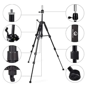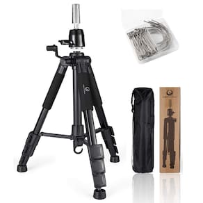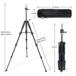 -?Ajuste preciso da altura?- As pernas retráteis do tripé do suporte para perucas têm 4 seções que podem ser estendidas de 18” a 55”, o que é conveniente para transportar ou armazenar. Uma haste de elevação no tripé pode ajustar a altura do pescoço médio para alcançar uma posição precisa.
