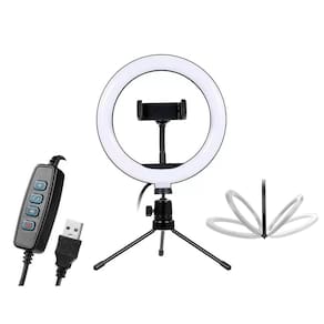 Ring light iluminação para gravações e selfies! Suas fotos e vídeos com qualidade profissional!Isso mesmo grave suas lives ou tire aquela foto bem iluminada usando a Ring Ligth que lhe trará esse benefício e muitos outros!Ela também pode ser usada para estúdio de maquiagem ou para trabalhos em home officee diversas outras situações em que você precise de uma iluminação extra!A Ring Light 20 cm , 8 polegadas possui 3 tons e várias intensidades que podem ser ajustados no controleintegrado ao cabo USB de energia (Branco-frio/ branco-quente e neutro).A Ring Light segue acompanhada de um suporte de celular, além de um excelente Ring Light você também terá um tripé de mesa.marca da lampada NBCConteúdo:- Ring light 20cm 8 polegadas- Tripé de mesa- Suporte de celular- Controle de tom e intensidade integrado ao próprio cabo USBA Ring Light segue acompanhada de cabo USB, MAS NÃO ACOMPANHA FONTE,( utilize uma fonte com 5v máximos e sempre maior ou igual a 2.1A .Fontes comuns de celulares costumam funcionar perfeitamente, só não recomendamos o uso de carregadores turbo.Produto de ótima qualidade!Testado antes do envio para que nossos clientes não tenham nenhum problema em seu recebimento!
