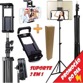 Tripé pedestal 2,10m profissional suporte 2 em 1 encaixe para celular e tablet apoio universal ajustável rosca 1/4 Tripé robusto de alta qualidade, possui molas internas para amortecimento, braçadeiras reforçadas em nylon, altura de 2,10 mts, abertura dos pés de 88 cm promovendo boa estabilidade, pino 5/8 com rosca 1/4 para usar diversos tipos de equipamentos. Pintura preta, tornando - o mais discreto no ambiente de cine & foto. Reforçado, chegando a suportar 6 kg , pode ser com diversos equipamentos de iluminação. acompanha suporte para celular e tablet . Além disso este tripé é um modelo muito recomendado para utilização junto a equipamentos fotográficos e iluminação, uma vez que possui uma estrutura resistente com composta por materiais de alumínio e partes plásticas, conseguindo alcançar uma altura máxima de 2,10 metros e mínima de 68cm quando totalmente fechado, pesando somente cerca de 780 gramas, sendo portanto, carregado com muita facilidade e praticidade. O tripé de iluminação tpi-200 ainda possui 3 seções e 3 travas, que proporcionam ao usuário uma regulagem na altura, de forma que possibilite ao mesmo criar diversos modos de uso, conforme a necessidade de operação em cada um de seus trabalhos. Suporte adaptador 2 em 1 para tablet celular Muito útil para selfies, fotos e gravações de vídeo para instagram, facebook, youtube, tiktok etc. Material de alta qualidade que prende firmemente o seu smartphone, tablet ou . Ideal para uso com mini tripé de mesa, pau de selfie ou qualquer tripé com sistema de rosca 1/4. Abertura compatível com aparelhos celulares de 5,5 até 8,5 cm de largura. Abertura posterior para aparelhos de 11 até 18 cm de largura. O kit contém: 1 tripé profissional de até 2,10m de alcance 1 suporte adaptador 2 em 1 para tablet e celular Atenção: Não acompanha celular ou dispositivos. lacrado em sua embalagem .
