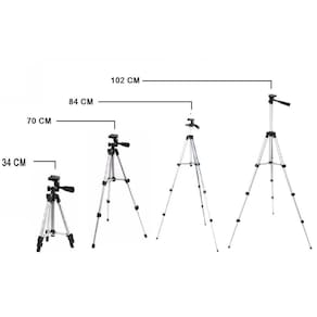 - cor: preto ou prata - aplicação: máquinas fotográficas digitais e videocâmaras com conector para tripé - cabeça móvel para diversos ângulos - nivelador de bolha - pernas em alumínio - altura ajustável em 3 seções em prolongadores com travas - pés emborrachados antiderrapantes - braço para rotação da base da câmera - haste central - altura: estendido: 102 cm, fechado: 34 cm - peso: 400g