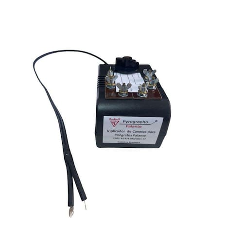 O triplicador de canetas palante para rodízio de canetas é um acessório para ser conectado aos pirógrafos, é indicado para artistas que utilizam o pirógrafo por um longo período onde a caneta esquenta muito ou que utilizam várias ponteiras para efeitos diferenciados. O triplicador possui 3 saídas onde são ligadas canetas diferentes, quando houver aquecimento da caneta em uso, basta trocar para a outra que está totalmente fria e dar continuidade ao seu trabalho sem a necessidade de desligar o pirógrafo. Para quem trabalha com ponteiras diferentes, ele possibilita que se alterne entre as canetas durante a execução do trabalho, com isso aumenta a durabilidade das pontas e agiliza o trabalho gerando maior produção. O triplicador de canetas aumenta a durabilidade das canetas, pois elas trabalharão menores períodos pois estarão em descanso sempre que ficarem quentes. Pode ser utilizado nos pirógrafos modelo: em-6, em-7, cm-10, am-12, pm-13 e nos modelos industriais.