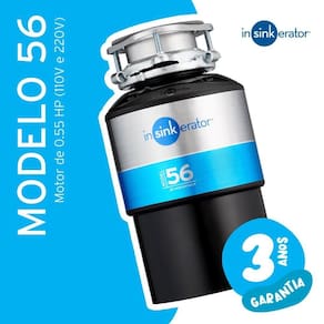 Triturador de resíduos alimentares InSinkErator modelo 56 com tecnologia de trituração de um estágio, motor de indução de alto torque e elementos de trituração em aço inoxidável. Os resíduos alimentares são triturados em pequenas partículas e descartados em segundos