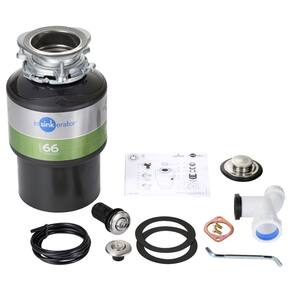 Triturador de resíduos alimentares InSinkErator® modelo 66 com tecnologia de trituração de um estágio, motor de indução de alto torque, elementos de trituração em aço inoxidável e interruptor pneumático embutido cromado.
