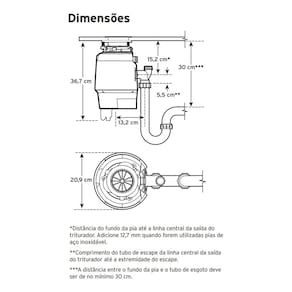 - Tensão 110V/127V: NÃO É BIVOLT. - Amperagem: 10A (N). - Potência do motor: 0.75 HP (50Hz - 60Hz) - 380W. - Motor: monofásico. - Tipo de alimentação: contínua. - Controle liga/desliga: interruptor pneumático. - Capacidade da câmara de trituração de 980ml. - Abertura da pia: 90mm (válvula americana 4 1/2"). - Distância entre entrada esgoto e abertura da pia: 30cm. - Ponto de esgoto: 40 a 50mm. - Tecnologia de trituração de 2 estágios: partículas ainda menores (em comparação ao modelo de 1 estágio). - Trituração avançada para resíduos alimentares mais rígidos ou fibrosos. - Os resíduos alimentares são triturados em pequenas partículas e descartados em segundos. - Seguro para uso com fossas sépticas com manutenção adequada. - Motor de indução de alto torque. - Proteção contra a sobrecarga. - Proteção do motor: reset automático. - Limpo, higiênico, prático, totalmente seguro e simples de usar. - Uso médio de água: aprox. 4L/dia por pessoa. - Solução definitiva para o lar, pois é compacto e fica embaixo da pia sem tomar espaço valioso para armazenamento. - Método fácil de descartar resíduos alimentares no lar, economizando tempo e ajudando a minimizar as idas à lixeira. - Ambientalmente responsável, ajudando a reduzir a quantidade de resíduos destinados aos aterros sanitários. - Consumo médio de energia elétrica: 3-4 KWH por ano. - Conexão do dreno: 1-1/2" (3.81 cm) - junta deslizante com amortecimento. - Tecnologia de instalação Lift & Latch que facilita a instalação em cozinhas e pode ser instalada na maioria das pias. - Acessórios "para respingo" removível. - Elementos de trituração em aço inoxidável (inox). - Conexão do dreno da lava louças: sim. - Lubrificação: rolamentos superiores e inferiores permanentemente lubrificados. - Classificação de tempo: intermitente. - Design compacto que otimiza o espaço. - Com INMETRO. - Altura total: 36.7cm. - Dimensões: 36.7 x 20.9 x 20.9cm (A x L x C). - Peso total aproximado: 8.12kg. - Cor: preto/cinza (cor única). - Modelo: Premium 700 SR. - Marca Insinkerator.