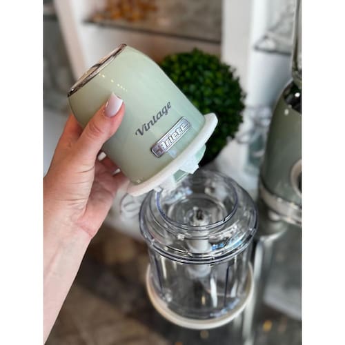 Triturador elétrico com design retrô, 4 lâminas de aço inoxidável, 2 velocidades e pés antiderrapantes.Funções