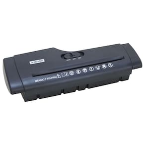 Fragmentadora de papel com capacidade de até 07 folhas. Equipamento destinado para uso doméstico ou em escritório. *Leia sempre o manual de instruções. **Não acompanha cesto. Estilo de Corte corte em tiraNível de segurança P-2 (Norma DIN 66399)Botão com 3 posições Auto/Off/RevSensor automático de presença de papelProteção contra super aquecimento do motorCiclo de trabalho Periódico de 2 min. (De acordo com a temperatura ambiente) 40 min. RepousoLargura da entrada 220mmCapacidade 07 folhas (A4)DimensõesLargura 33 6cmProfundidade 11 5cmAltura 6 67cm