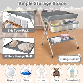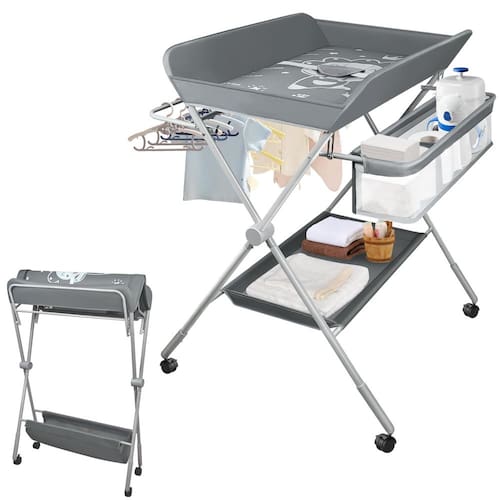 Especificação: Cor: cinza Padrão: Little Lion Tecido: tecido Oxford adequado para a pele Faixa etária: 0 a 12 meses Característica: altura ajustável Amplo espaço de armazenamento Fácil de dobrar e ótimo para economizar espaço Meça a altura do bebê Não é mais necessário se curvar para trocar fraldas ou massagear bebês O cinto de segurança e os painéis de tecido de proteção de 4 lados - Altura ajustável: o trocador de bebês foi projetado com três configurações de altura ajustáveis, variando de 37,4 polegadas a 41,3 polegadas, atendendo a pais de todos alturas. Isso evitará significativamente que dores nas costas e dores se dobrem ou se ajoelhem. Fácil de dobrar: a placa de suporte de design exclusivo é cortada no meio e pode ser dobrada diretamente, empurrando-a de baixo para cima. As barras dos dois lados também podem ser facilmente retraídas. O trocador de fraldas dobrável economiza espaço de forma eficaz quando não está em uso - Amplo espaço de armazenamento: o trocador de fraldas é equipado com uma cesta de armazenamento na lateral e espaço de armazenamento na parte inferior, que pode conter todos os itens essenciais do bebê ao alcance. Além disso, a lateral também pode ser usada como escorredor - Segura e confiável: nossa estação de troca de fraldas portátil foi projetada com tecido Oxford seguro e ecológico e com uma estrutura de aço resistente à prova de ferrugem de alta qualidade para garantir a segurança de seu bebê - Design inteligente: o cinto de segurança e os painéis de tecido de proteção de 4 lados na mesa de fraldas podem proteger melhor o bebê e evitar que ele caia - Design da balança de medição: O bebê portátil O trocador tem uma escala de altura impressa na superfície para ajudar os pais a medir a altura do bebê e testemunhe seu crescimento - Fácil de mover: o trocador de fraldas para bebês foi projetado com 4 rodas universais para facilitar a mobilidade. O design com fechadura garante estabilidade durante o uso, tornando-o uma opção segura e conveniente para montar sua creche doméstica. Amplamente utilizado: nosso trocador portátil para bebês tem vários usos, não apenas para trocar fraldas, massagear e trocar roupas para bebês, mas também como cabide para pendurar roupas e toalhas e como tábua de passar roupas para passar roupas