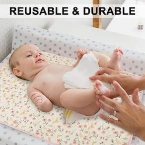 Forros de trocador reutilizáveis: o tecido de musselina é fácil de limpar e lavável na máquina. O lado de couro PU que pode ser limpo é só limpar com um lenço umedecido ou um pano úmido.
