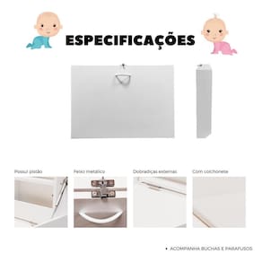 Caracterisricas: - projeção na parede: aberto: 73 cm / fechado: 12cm - dimensões aproximadas: 74x47 cm - capacidade: 52 kg - cor: branco - mdf; - possui buchas e parafusos para fixação na parede; - colchonete almofadado com espessura de 02 cm - fechamento trava metálico; - pistões a gás. - super resistente.