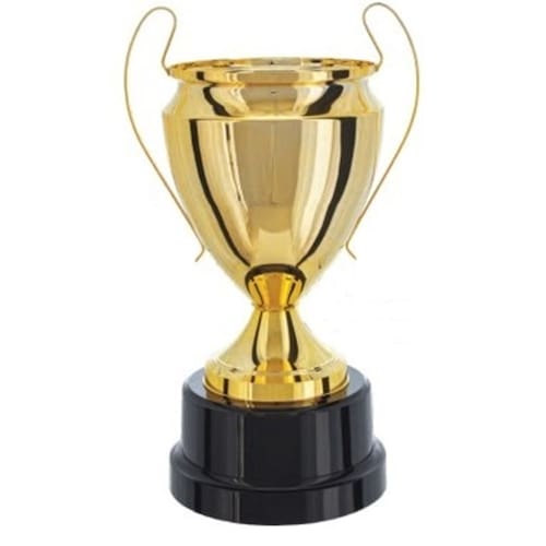 700733-DO -Troféu de Metal com altura de 49 cm com base redonda de 21 cm de largura em polímero na cor preta. Sobre esta base uma peça com capa em metal na cor dourada com duas alças acima da taça.
