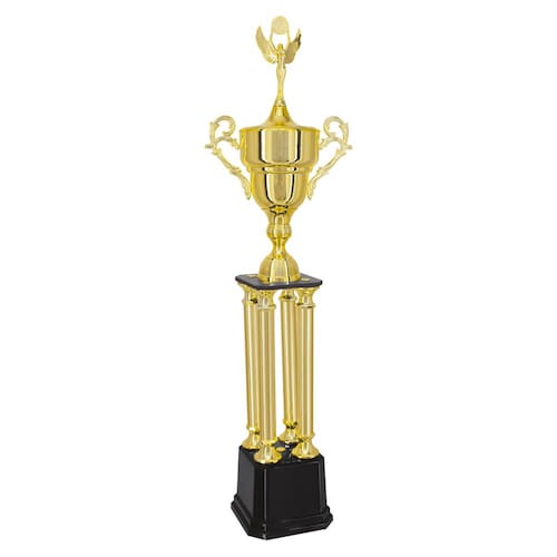 COMPONENTES FABRICADOS EM POLÍMERO: BASE OITAVADA, SUPORTES, COLUNAS, TAÇA COM ALÇAS, TAMPA, ESTATUETA SUPERIOR.