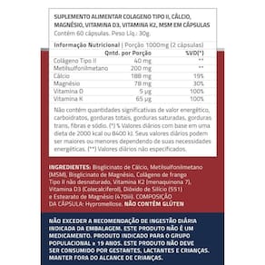 - Composição: Bisglicinato de cálcio, metilsulfonilmetano MSM , bisglicinato de magnésio, colágeno de frango tipo II não desnaturado, vitamina K2 menaquinona 7 , vitamina D3 colecalciferol , dióxido de silício 551 e estearato de magnésio 470iii . Cápsula: Gelatina.
