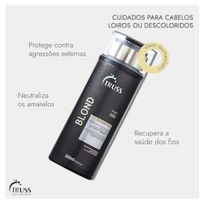 Shampoo para cabelos loiros ou descoloridos. Truss blond shampoo recupera a resistência dos fios e neutraliza o amarelado enquanto deixa o toque macio e a aparência mais brilhante. Com tecnologias que recuperam a elasticidade, truss blond shampoo protege contra as agressões externas. Possui pigmentos violetas que resgatam o brilho platinado e eliminam o aspecto amarelado de forma progressiva. Condicionador para cabelos loiros, descoloridos ou grisalhos. Truss blond conditioner ajuda a neutralizar o tom amarelado e hidrata. Truss blond conditioner contém pigmentos violetas que eliminam o amarelamento da oxidação dos fios, causado pela exposição ao sol, uso de ferramentas de calor e demais agressões. Além disso, possui tecnologia que trata os fios de dentro para fora. Ela aumenta elasticidade e sela as cutículas, o que confere maior resistência contra a quebra, além de luminosidade constante e maciez que dura o dia inteiro.