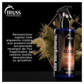 Truss uso obrigatorio blond tratamento reconstrutor 260ml Truss uso obrigatório blond restaura a integridade dos fios ao mesmo tempo que neutraliza os tons amarelados e alaranjados indesejados para promover um efeito platinado bonito. Como a química, sobretudo a descoloração, danifica bastante os fios, truss uso obrigatório blond é rico em ativos que fortalecem, hidratam e nutrem, de forma encorporar o cabelo para que ele se torne mais resistente. Logo na primeira aplicação é possível sentir o resultado.
