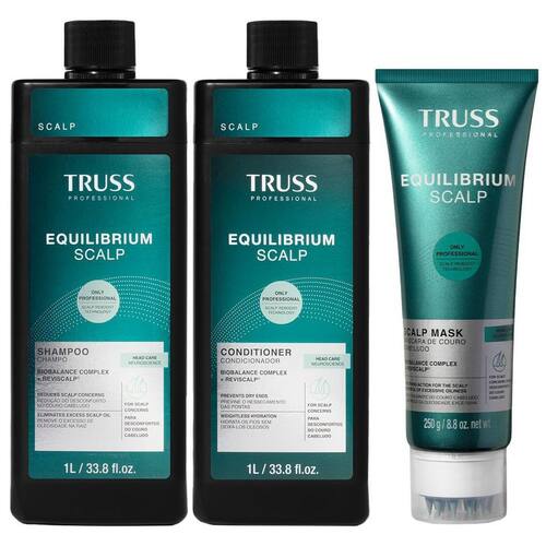 Truss Equilibrium Scalp Kit Shampoo Condicionador 1L e Máscara 250g SHAMPOO EQUILIBRIUM SCALP Shampoo anticaspa com pH adaptado ao couro cabeludo, limpa profundamente, remove impurezas e controla a oleosidade. Sua fragrância fresca de Neroli, Bergamota e Flor de Laranjeira proporciona uma experiência sensorial revigorante. Limpeza profunda; Controle da oleosidade; Fragrância refrescante. Tecnologia Scalp Reboost. Como usar Aplique o shampoo sobre os cabelos molhados, massageie suavemente e enxágue. Repita a operação se necessário. CONDICIONADOR EQUILIBRIUM SCALP Condicionador que previne o ressecamento das pontas e hidrata os fios sem pesar. Com fragrância fresca de Neroli, Bergamota e Flor de Laranjeira, proporciona maciez e desembaraço. Hidratação intensa; Maciez e desembaraço; Fragrância refrescante. Tecnologia Scalp Reboost. Como usar Após o uso do shampoo, retire o excesso de água dos fios e distribua o condicionador no comprimento e pontas. Massageie, desembarace, deixe agir por 2 minutos e enxágue. A Máscara de Couro Cabeludo Equilibrium Scalp acalma e promove sensação de alívio para o couro cabeludo, amenizando desconfortos e irritações.. Com fragrância fresca de Neroli, Bergamota e Flor de Laranjeira, ele faz do seu momento de cuidado uma experiência ao mesmo tempo, relaxante e revigorante. Modo de uso Após o uso do shampoo, com os cabelos molhados, aplique a Máscara diretamente no couro cabeludo, em movimentos circulares com o auxílio do acoplado na embalagem. Para abrir o aplicador, gire a tampa da bisnaga até a opção ON. Espalhe por toda a região massageando suavemente, deixe agir por 10 minutos e depois enxágue. Para fechar o aplicador, gire a tampa para a opção OFF.