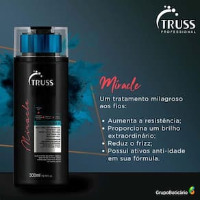 - O Condicionador Truss Miracle também ajuda a recuperar a elasticidade e resistência. Além disso, a fórmula combate o frizz e mantém os fios sedosos e suaves por muito tempo. O cabelo fica desembaraçado, reparado e com brilho radiante.