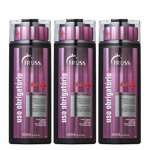 Truss uso obrigatório plus+ kit condicionador 3x300ml Com uma tecnologia inovadora e poderoso efeito antiquebra, a linha uso obrigatório plus+ recupera, reestrutura e repara totalmente as áreas da fibra capilar que estão fragilizadas, danificadas e quebradiças, atuando na reconstrução dos fios desde o seu interior.