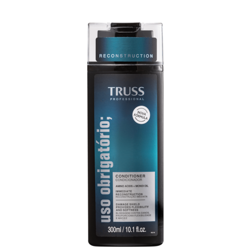 O Condicionador TRUSS Uso Obrigatório Reconstruction traz fórmula com ingredientes poderosos, como os Aminoácidos e o Monoi Oil, que penetram profundamente na fibra capilar e promovem reconstrução imediata, brilho, flexibilidade e maciez. Nenhum produto TRUSS é testado em animais, ou seja, este produto possui o selo Cruelty Free.