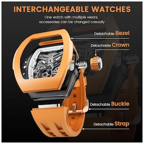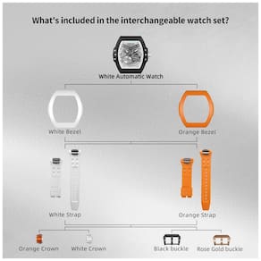 O que você recebe? Um conjunto completo com relógio automático, 2 bezels, 2 pulseiras, 2 coroas e 2 fivelas, possibilitando sua customização total. Além da beleza e estilo contemporâneo que agrada homens modernos, o relógio é equipado com cristal sintético de safira altamente resistente a riscos. A caixa em fluoroelastômero aprimorado oferece maior resistência ao calor e durabilidade. A pulseira de fluoroelastômero é resistente ao suor, respirável, confortável e durável.
