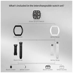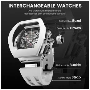 Descubra a versatilidade e elegância do relógio TSAR BOMBA Intercambiável para homens. Este relógio inovador permite que você personalize seu estilo com dois conjuntos completos de bezels, pulseiras e coroas intercambiáveis, oferecendo inúmeras combinações para você se destacar em qualquer ocasião, seja em eventos diários, semanais ou mensais. O design sofisticado em formato tonneau com uma ponte dupla arqueada proporciona conforto excepcional ao uso prolongado. A instalação dos componentes é simples: basta encaixar a coroa girando e pressionando firmemente para dentro, fixar a pulseira pressionando o botão traseiro e empurrando, e colocar o bezel pressionando firmemente nas posições indicadas. O kit inclui um relógio com movimento quartzo japonês preciso, 2 bezels, 2 pulseiras, 2 coroas e 2 fivelas para máxima personalização. O cristal de safira sintético altamente resistente evita riscos e a caixa de fluoroelastômero oferece resistência ao calor e durabilidade melhorada. Além disso, a pulseira feita do mesmo material é à prova de suor, respirável, confortável e durável. Este relógio é resistente à água até 100 metros, protegido contra suor, chuva e respingos, mas recomenda-se evitar o uso em água quente. Funcionalidades adicionais incluem calendário integrado e cronógrafo, tornando-o prático e divertido para o dia a dia. Um presente luxuoso para ocasiões especiais como Natal, Dia dos Pais, aniversários, casamentos e eventos casuais, o TSAR BOMBA é sinônimo de estilo e qualidade superior.